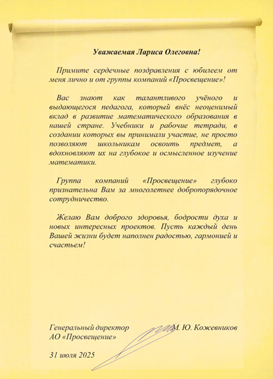 Поздравление и благодарность от АО «Просвещение» заведующему Лабораторией математического образования Рословой Ларисе Олеговне.